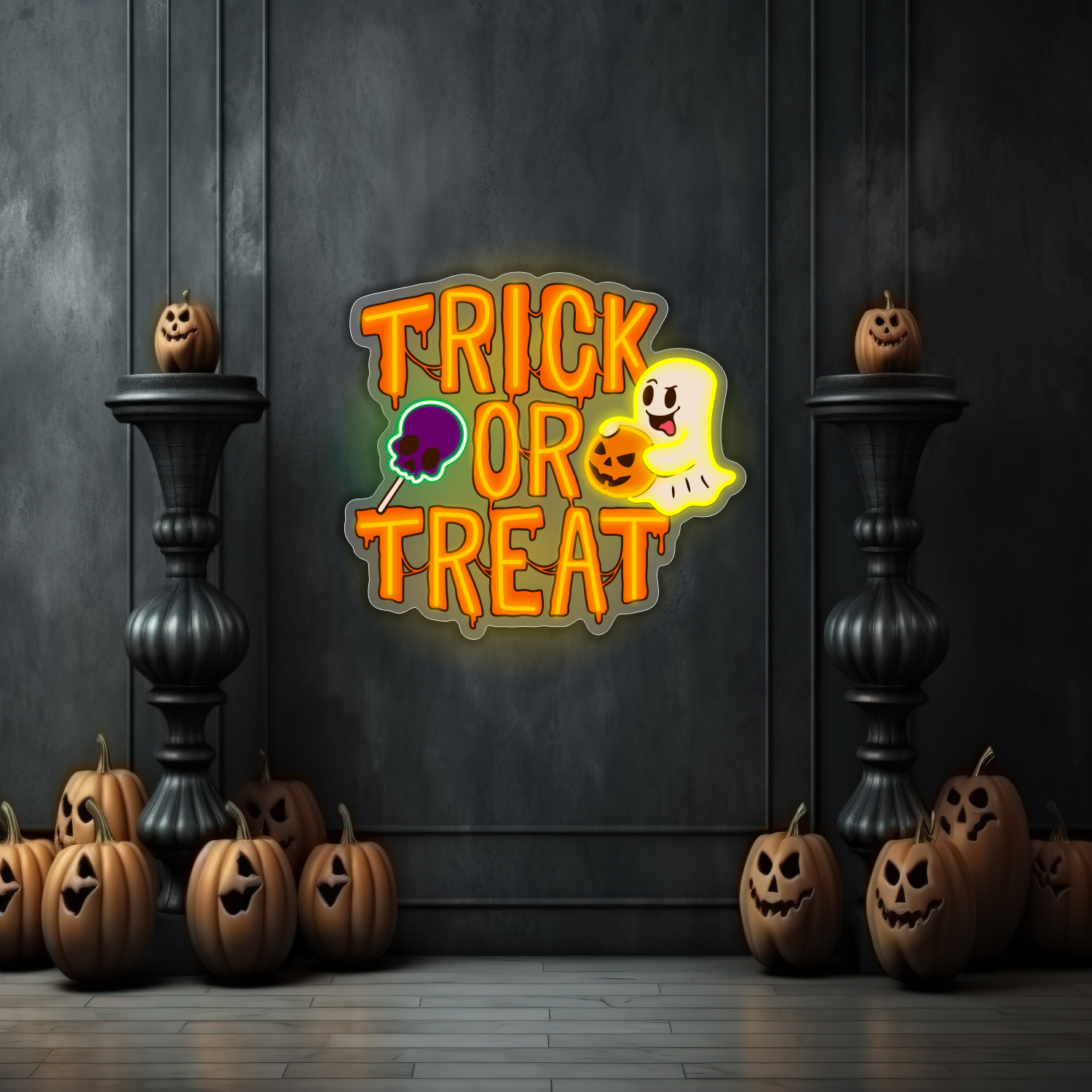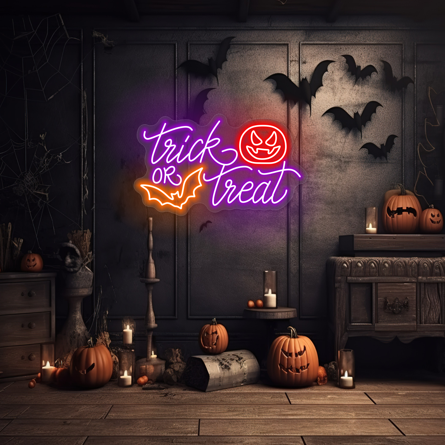 Add a spooky glow to your Halloween setup with the Trick or Treat Neon LED Sign with Pumpkin & Bat....