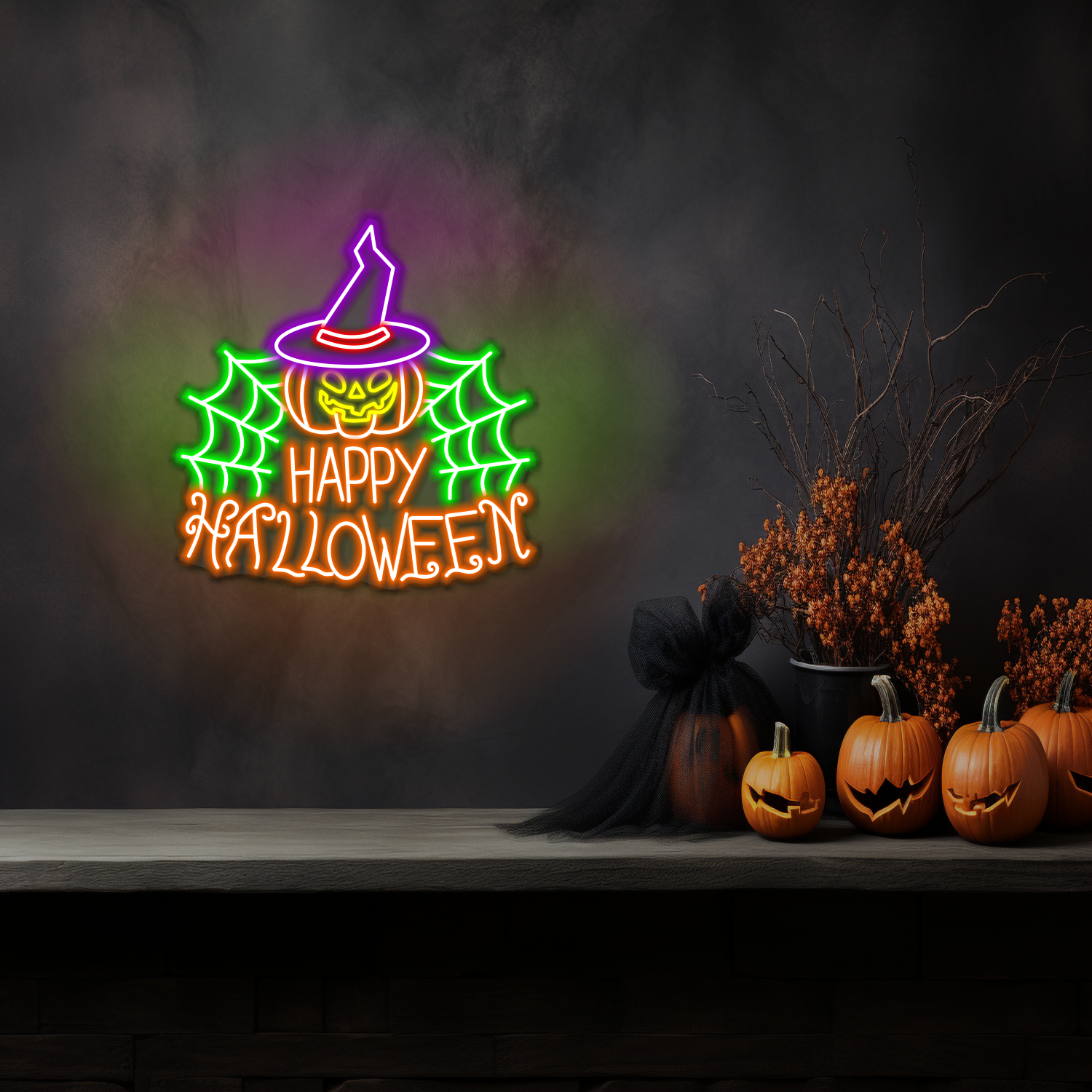 Bring your haunted nights to life with the Happy Halloween Neon LED Sign, featuring a glowing pumpkin in a witch...