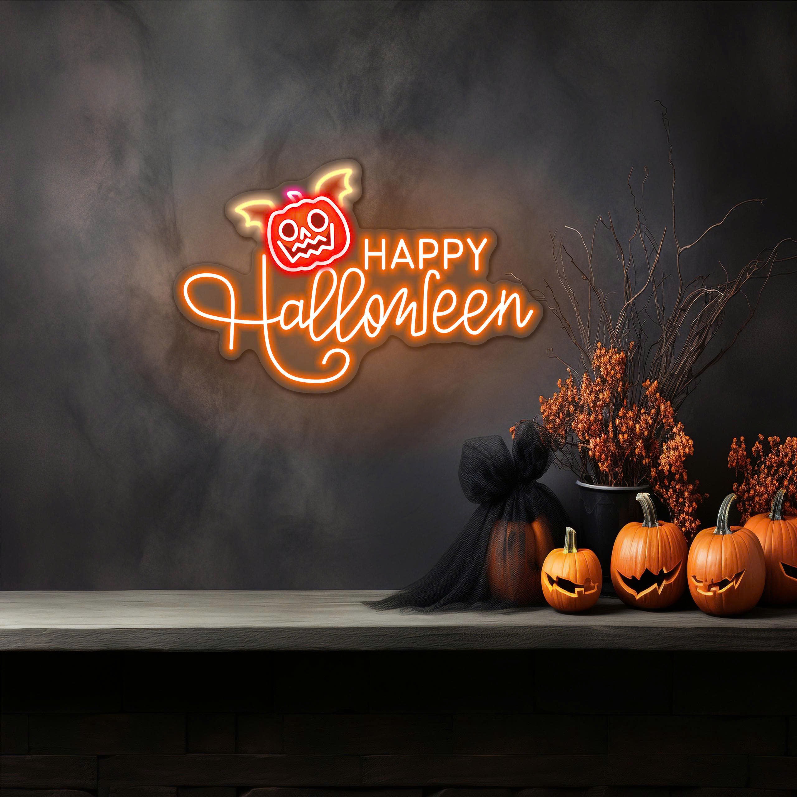 Celebrate the spooky season in glowing style with the Happy Halloween Neon LED Sign with Pumpkin. Featuring a cheerful jack-o’-lantern...