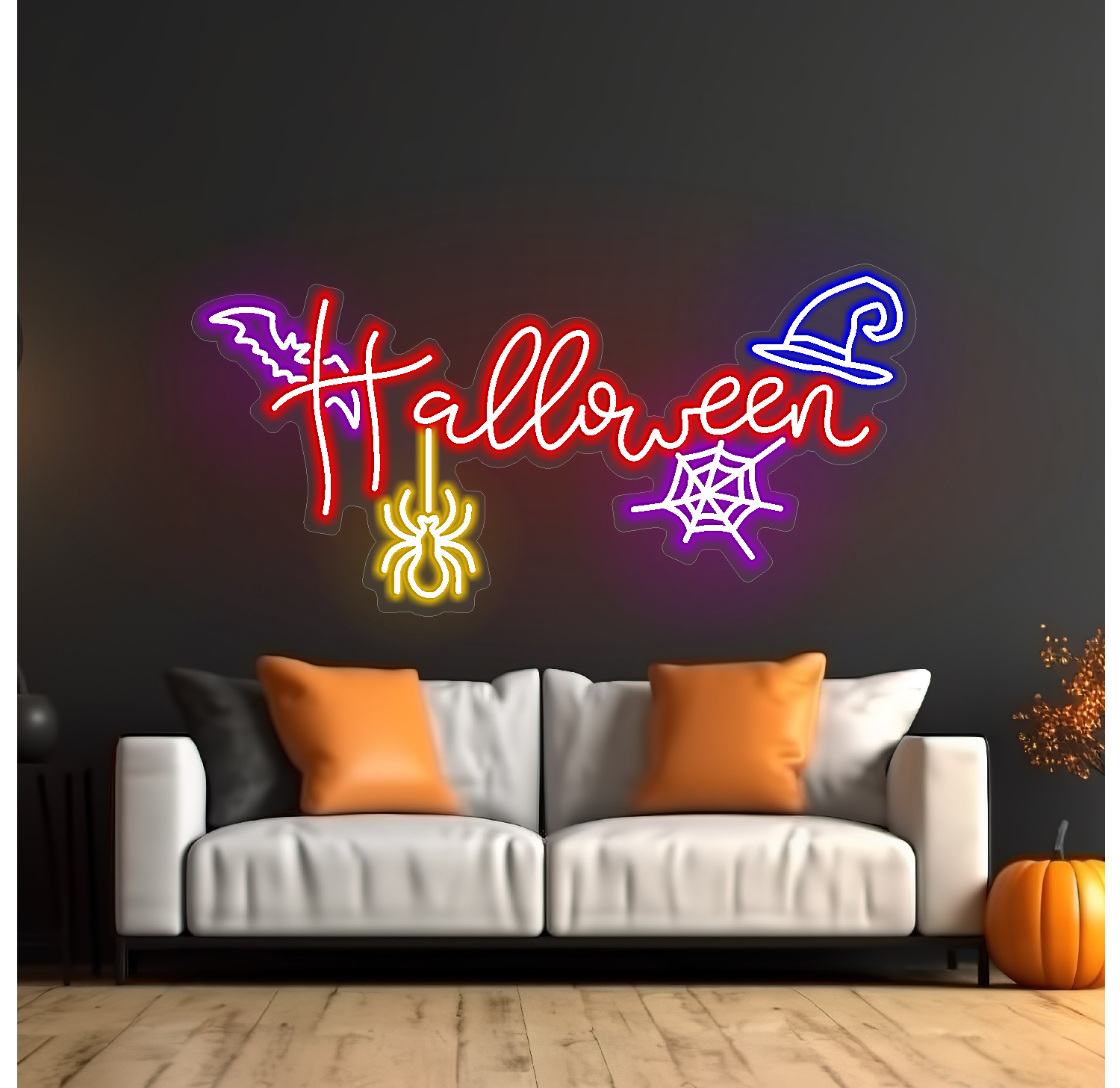 Light up your haunted nights with the Halloween Neon LED Sign with Bat, Spider & Witch Hat – a bold...