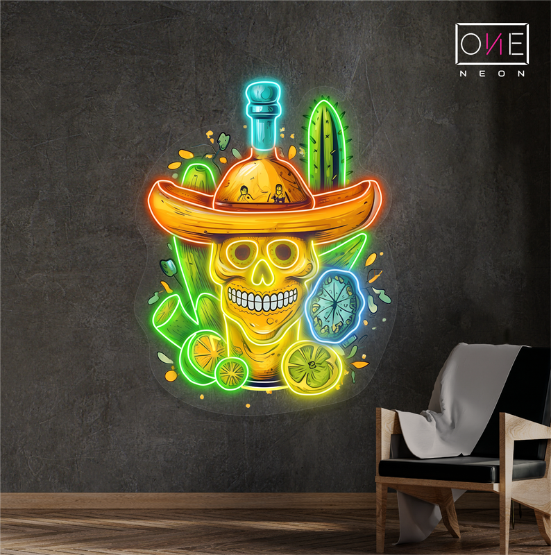Panneau néon à led avec tête de mort mexicaine et tequila